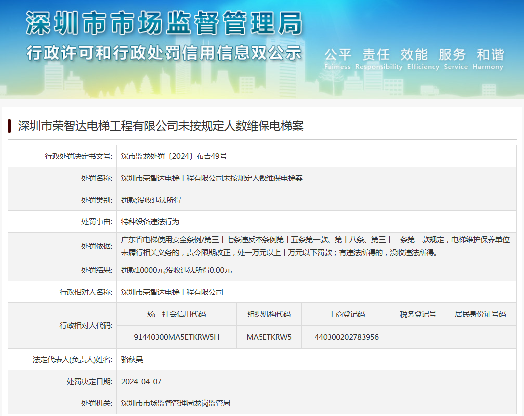 深圳市榮智達電梯工程有限公司未按規定人數維保電梯案