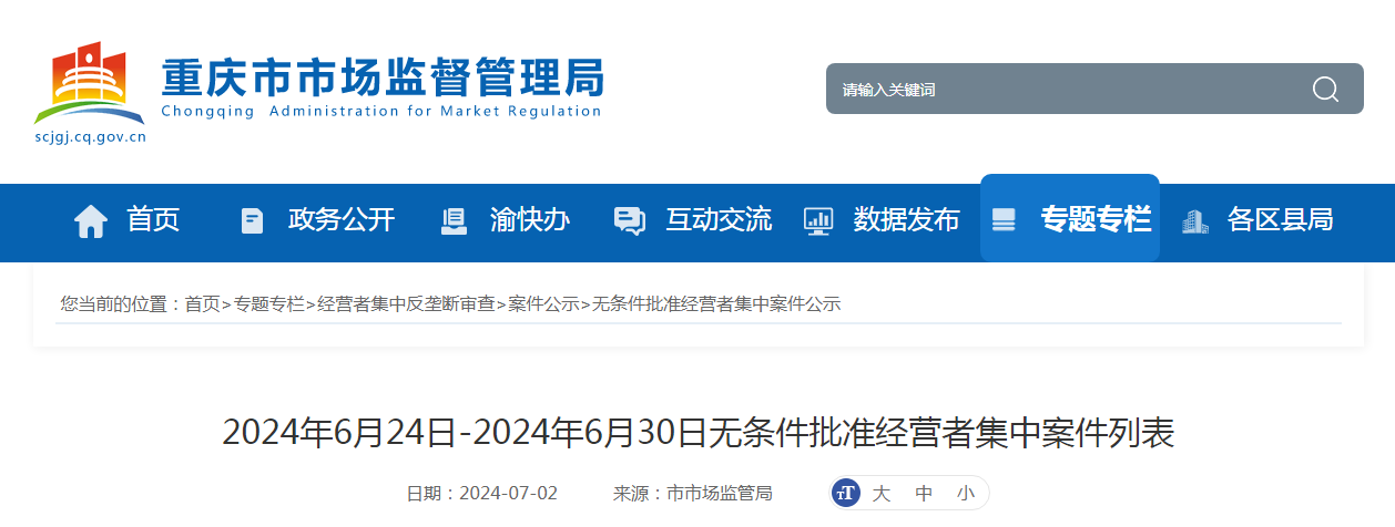 2024年6月24日-2024年6月30日無條件批準經營者集中案件列表
