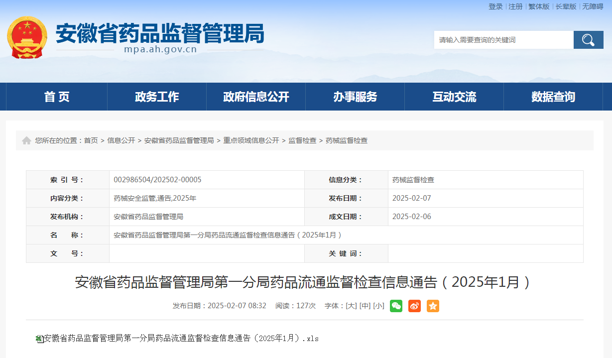 | 安徽省藥品監督管理局第一分局藥品流通監督檢查信息通告(2025年1月) | ||||||