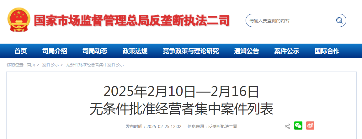 2025年2月10日—2月16日無條件批準(zhǔn)經(jīng)營(yíng)者集中案件列表