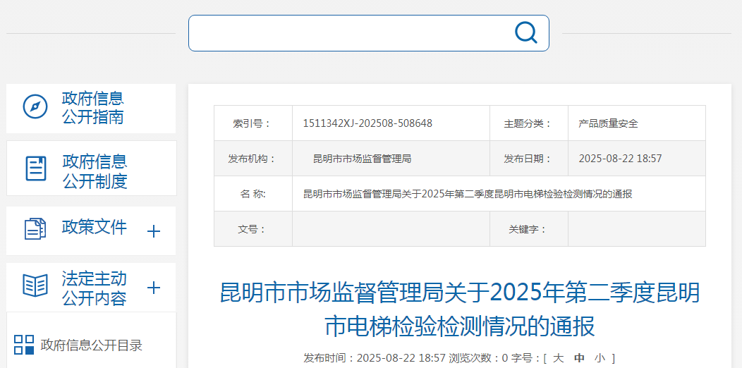昆明市市場監督管理局關于2025年第二季度昆明市電梯檢驗檢測情況的通報