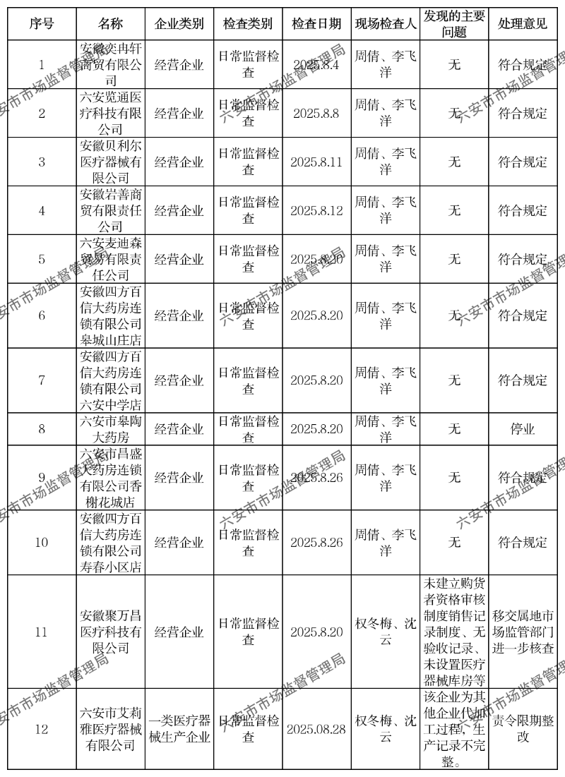 六安市市場監(jiān)管局2025年8月醫(yī)療器械監(jiān)督檢查公示表