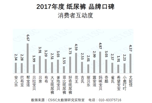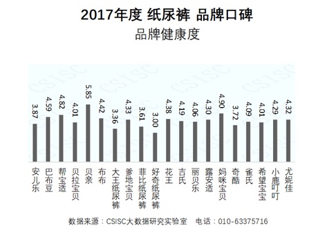 中國質量新聞網訊 CSISC大數據研究實驗室基于國統?首頁HOMEBA平臺數據和大數據技術手段,以第三方視角,從國內紙尿褲市場中篩選出20個表現比較突出的品牌作為研究對象,包括:安兒樂、巴布豆、幫寶適、貝拉寶貝、貝親、布布、大王、爹地寶貝、菲比、好奇、花王、吉氏、麗貝樂、露安適、媽咪寶貝、奇酷、雀氏、希望寶寶、小鹿叮叮、尤妮佳(以字母順序名次),綜合運用網媒、電商、論壇等網絡數據,通過品牌知名度、企業美譽度、品牌健康度、質量認可度、產品好評度、消費者互動度等六個維度對這20個紙尿褲品牌進行了品牌口碑指數評價,形成了《2017年度紙尿褲品牌口碑研究報告》(以下簡稱“報告”)。