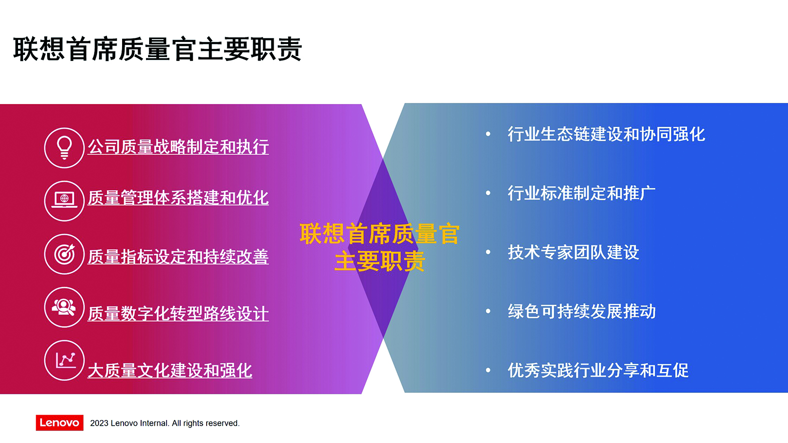 聯想深知質量的重要性,也意識到首席質量官制度是現代企業管理制度的重要內容,是明確質量責任、保障質量安全、提升企業競爭力的重要舉措。